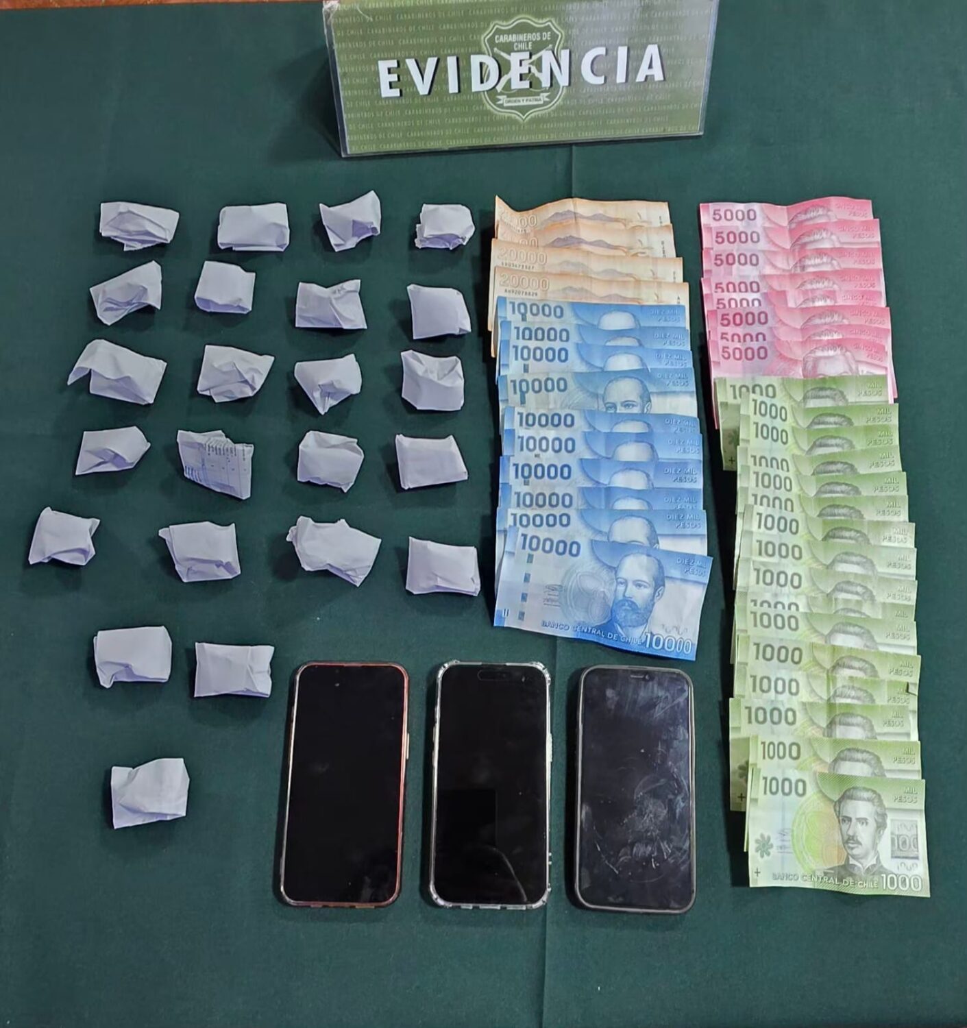 En el interior del vehículo se incautó una bolsa con varios envoltorios que contenían una sustancia vegetal atribuible preliminarmente a marihuana, además de teléfonos celulares, dinero en efectivo y el automóvil utilizado.